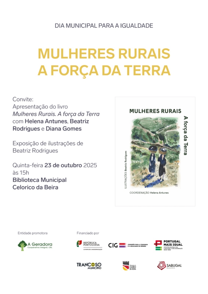 A Biblioteca Municipal de Celorico da Beira recebe no próximo dia 23 de outubro pelas 15H00, a apresentação do livro “Mulheres Rurais. A força da Terra”, com a presença das autoras da obra, Helena Antunes, Beatriz Rodrigues e Diana Gomes, e convidadas especiais, a par de uma exposição de ilustrações de Beatriz Rodrigues, alusivas ao mesmo.