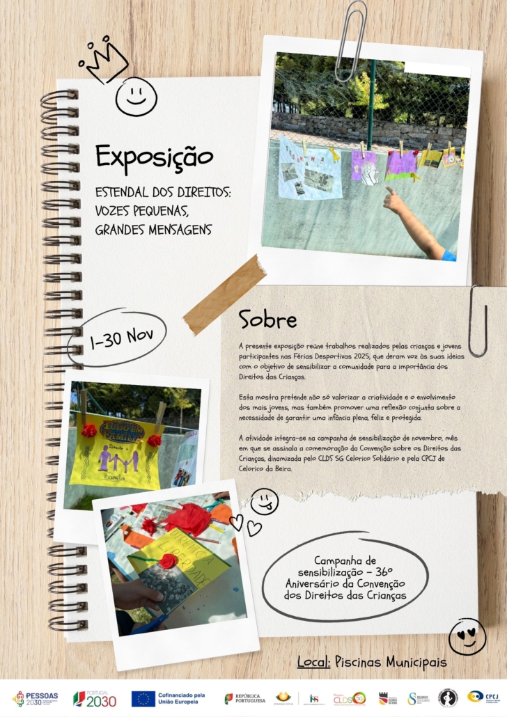 Vai estar patente ao público, de 1 e 30 de novembro de 2025, na Piscina Municipal de Celorico da Beira, a exposição “Estendal dos Direitos – Vozes pequenas, grandes mensagens”, composta por trabalhos elaborados por crianças e jovens, no âmbito de atividades sobre os Direitos da Criança, nas Férias Desportivas 2025.