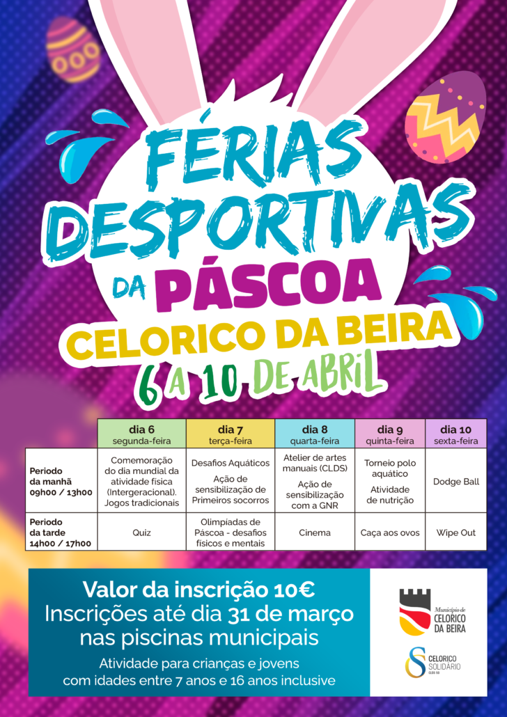 O Município de Celorico da Beira vai dinamizar, entre os dias 6 e 10 de abril, as Férias Desportivas da Páscoa, reservadas a crianças e adolescentes, dos 7 aos 16 anos, residentes no concelho.