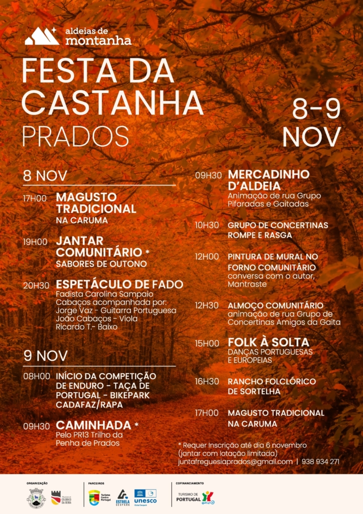 Durante este fim de semana, a aldeia de Prados vai receber de braços abertos os visitantes em clima de festa, perfumada com os cheiros e sabores do outono que fomentam a alegria e convidam à confraternização e à partilha. Serão presenteados com um vasto e recheado programa onde não falta música, do fado às concertinas, ao folclore e ao folk, desporto com uma caminhada e o início do campeonato de ENDURO TAÇA DE Portugal – BIKEPARK Cadafaz-Rapa, o tradicional Mercadinho D’Aldeia, degustações variadas e, obviamente, os tradicionais magustos.