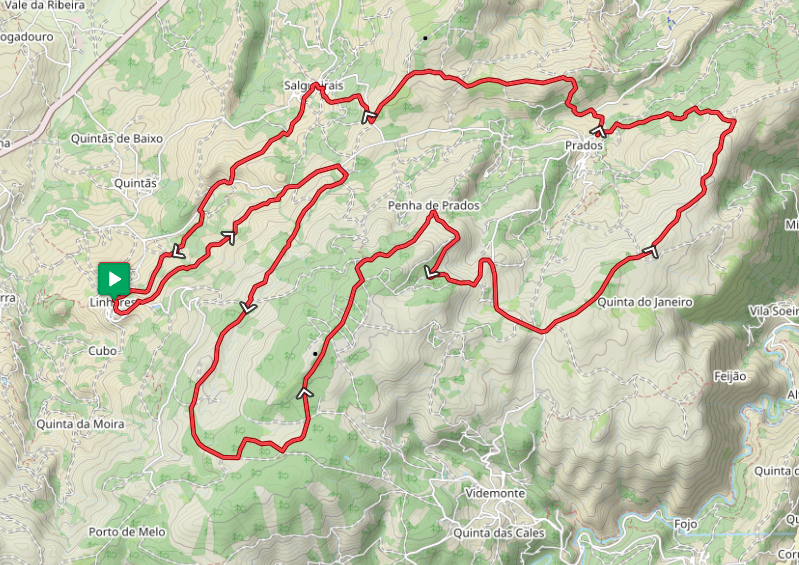 Saindo em conjunto com o percurso 2 até à descolagem do parapente, este percurso inflete aí para norte, subindo à Cabeça Alta, onde goza de uma ampla visão de 360º sobre a paisagem envolvente. Dirige-se para Prados passando antes pelas gravuras rupestres da Pedra Santa. No regresso a Linhares da Beira passa pela localidade de Salgueirais, com a sua escola-museu.